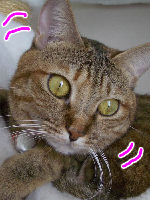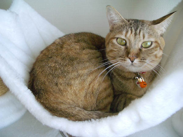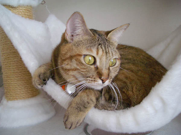 2008年 11/24(月/祝) 100日目のぴっち♀とぽっけ♂ ~伸びたり齧られたり~新規写真追加。猫タワーの最上段で楽しい伸びをするぴっち♀。ぽっけ♂に齧られて……。