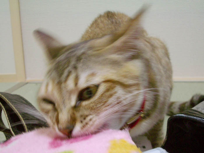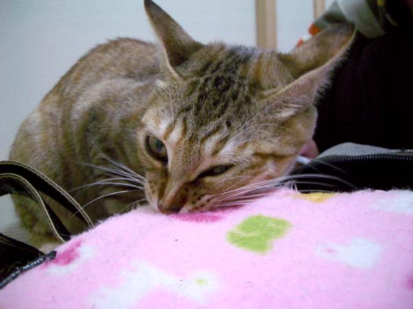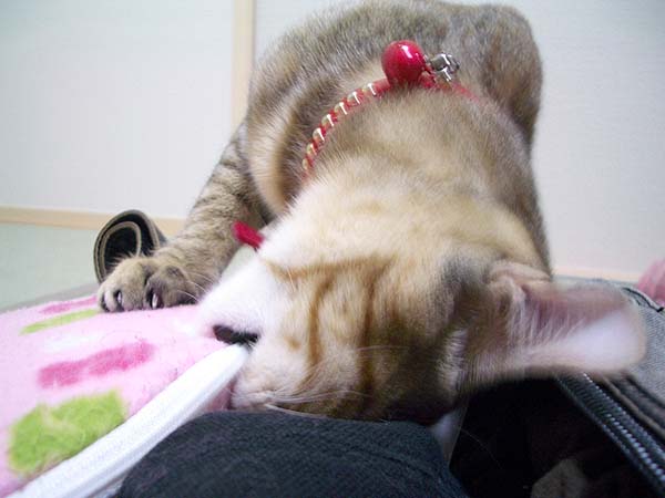 隣の和室へとカイロを運搬したぴっち♀。