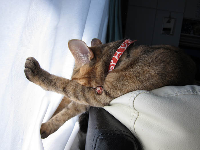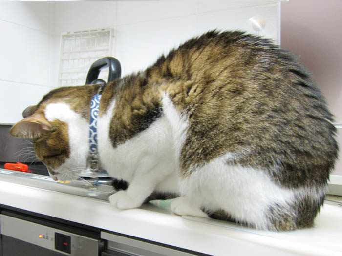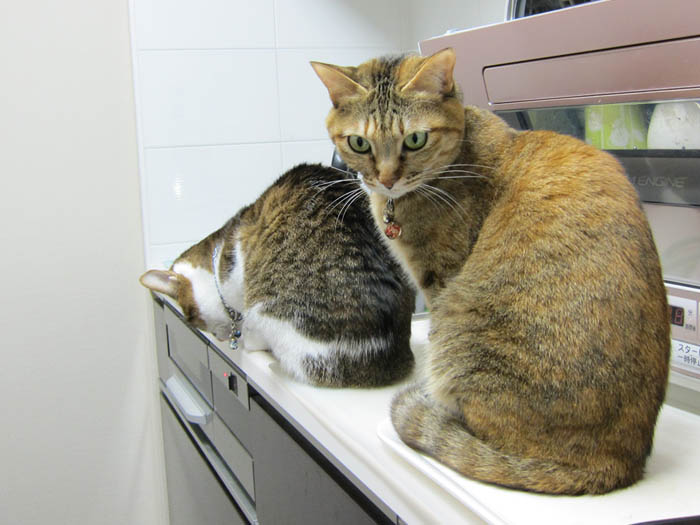 2009年 4/20(月) 247日目のぴっち♀とぽっけ♂ ~4つ足巻きと肉球暖め~新規写真追加。猫タワーでのぴっち♀と、シンクに居座るぽっけ♂。