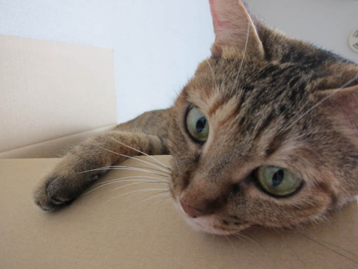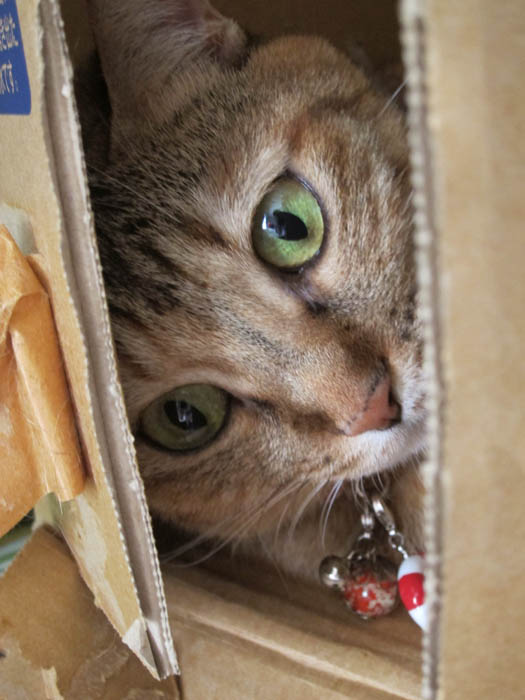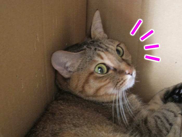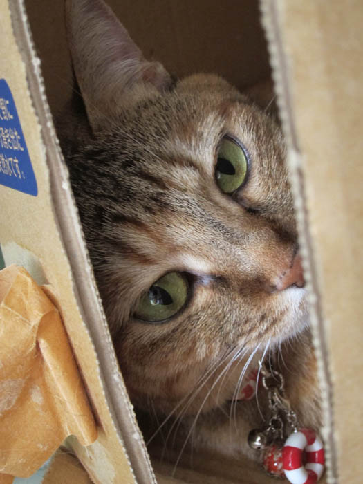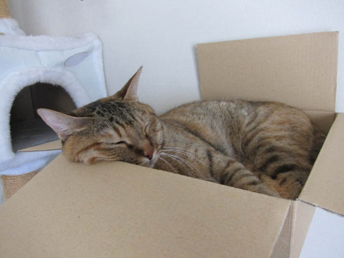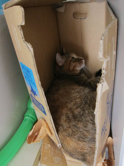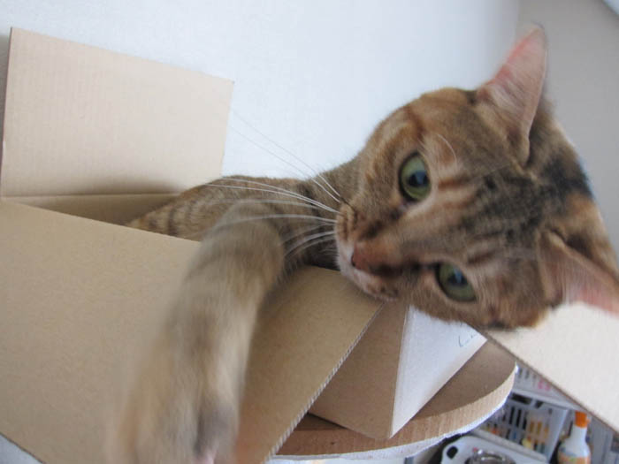 壁面収納の横にある、段ボールに飛び込んで行きました。