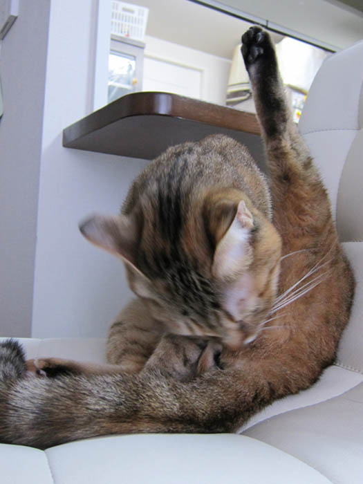 を真っ直ぐ上へと伸ばし、毛づくろいに励むぴっち♀。
