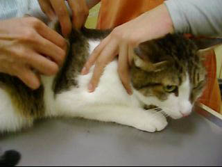 看護士さんに優しく保定されながらも、どうにか逃げようと、ゆるゆると前進しようとしていました。