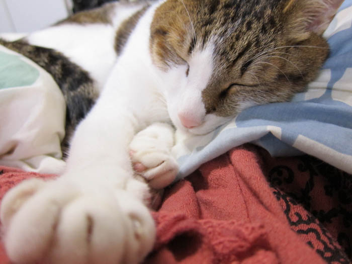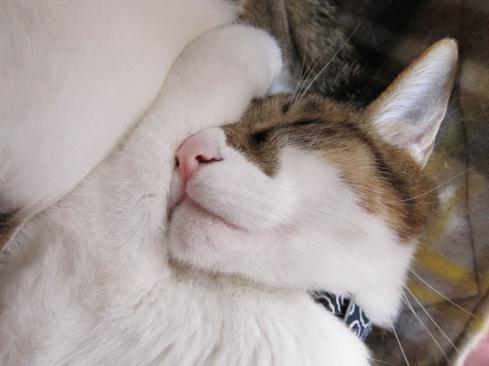 2011年 12/20(火) 1220日目のぴっち♀とぽっけ♂ ~組体操ならぬ組昼寝~かまくらの中で素敵に組み合ってお昼寝する2匹。肉球もあります。
