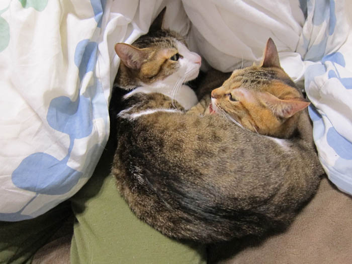 ぽっけ♂は布団、ぴっち♀は膝の間にそれぞれハマってマッタリ。