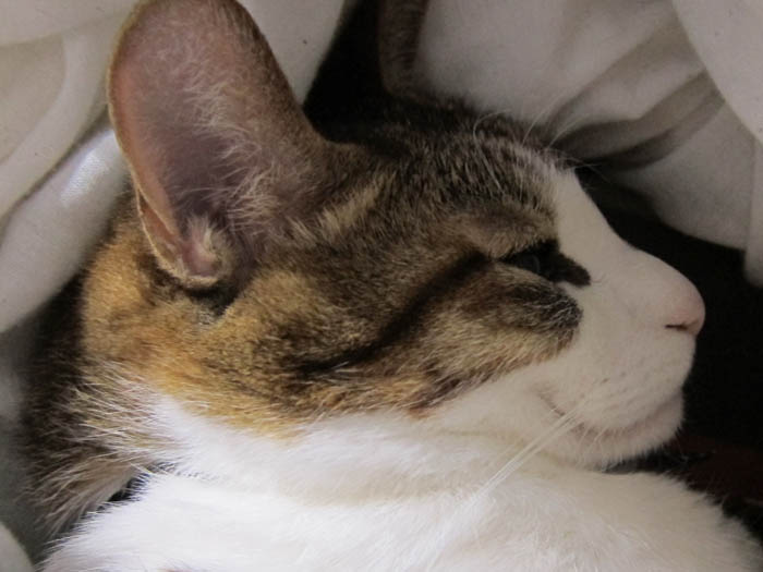 2010年 12/21(火) 857日目のぴっち♀とぽっけ♂ ~人間用枕を使う猫~ダヤンの枕で寝るぽっけ♂。しかも、正しく使っているのです……。