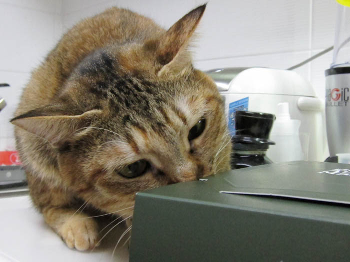 」箱の中からぽっけ♂の鼻先ペチリと軽い猫パンチ