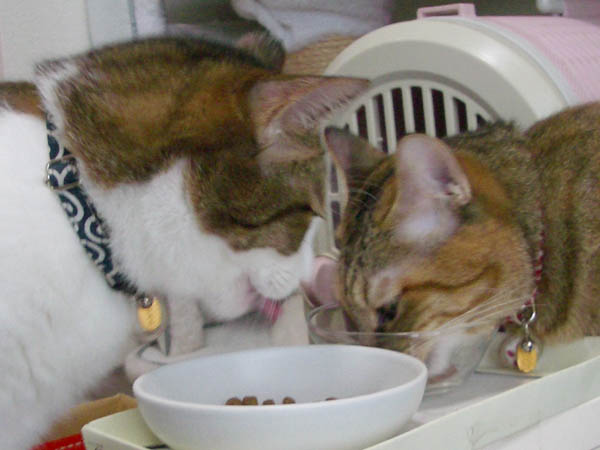 ごほうびカリカリとともに解放された2匹。