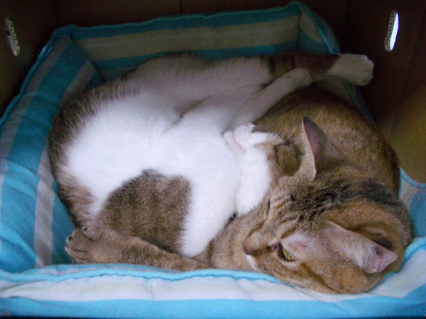 2008年 9/27(土) 42日目のぴっち♀とぽっけ♂ ~工夫してお昼寝?~新規写真大量追加。猫タワーでの2匹盛りのお昼寝は、寝姿も楽しいです。