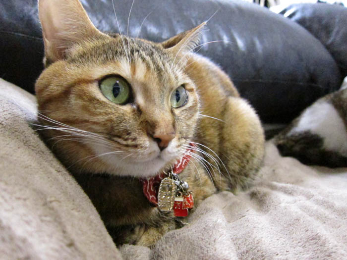 ソファー横の絨毯で上を見上げるぴっち♀。