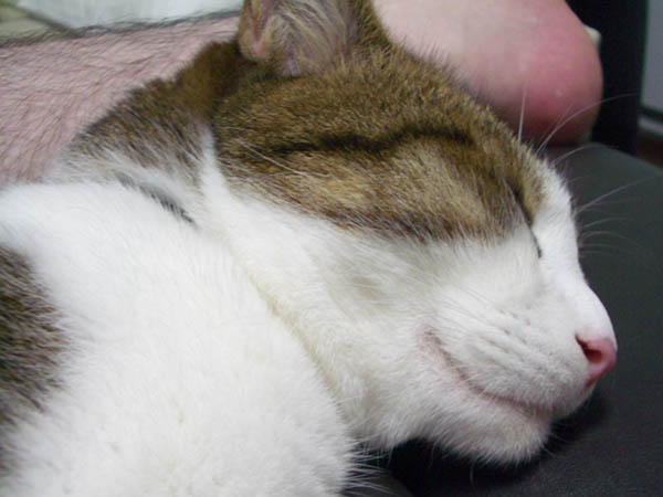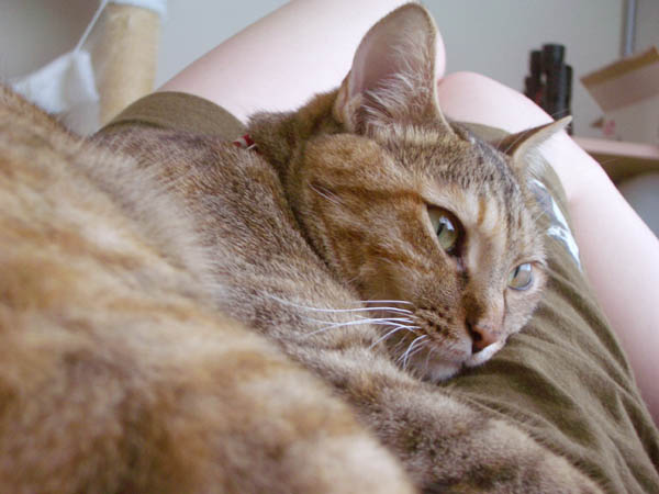 の足元へ移動。ぽっけ♂ 「ココ、ボクのマクラにするです~。」