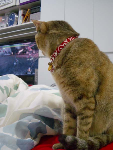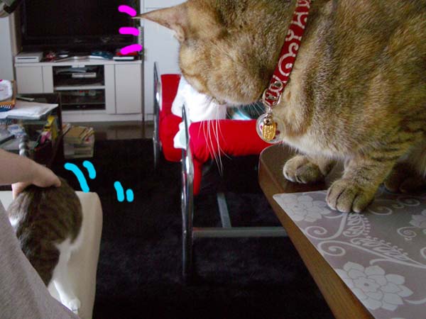 「オレの膝を取り合ってるみたいで、2匹にちょっとモテた気分で嬉しいナー。」