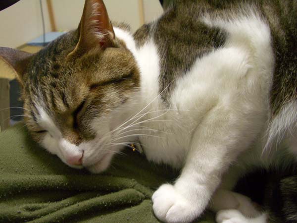 の膝で寝ています。普段は大抵私