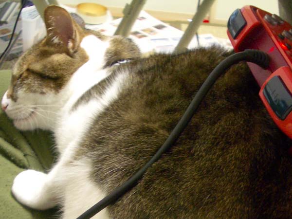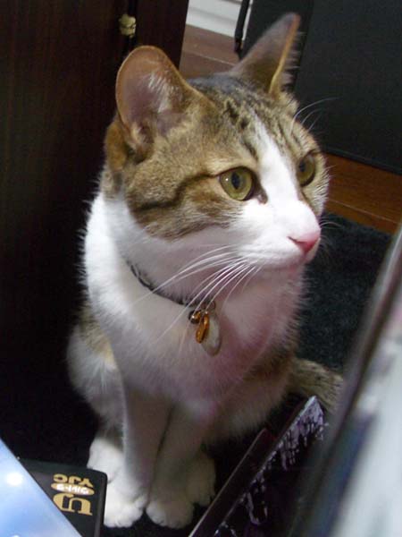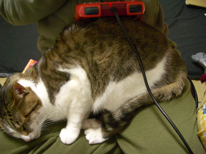 の膝に座っているぴっち♀。最近、週末になると私の代わりに