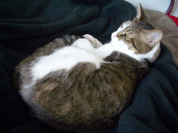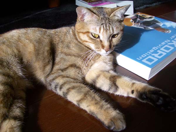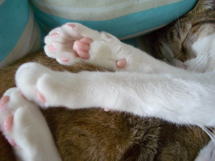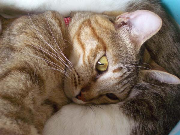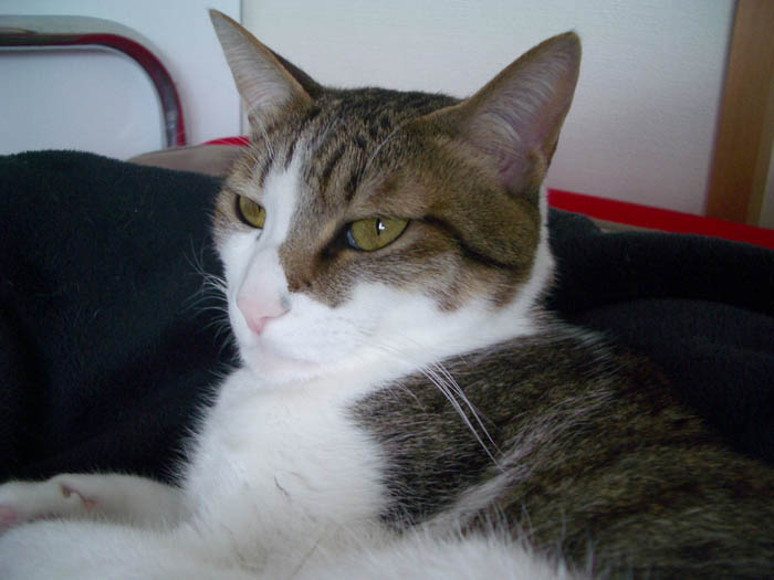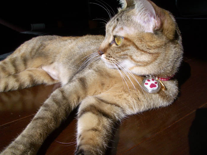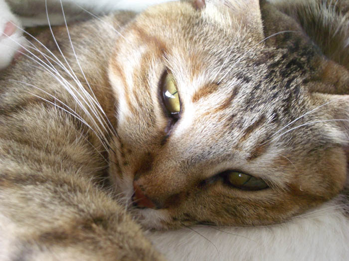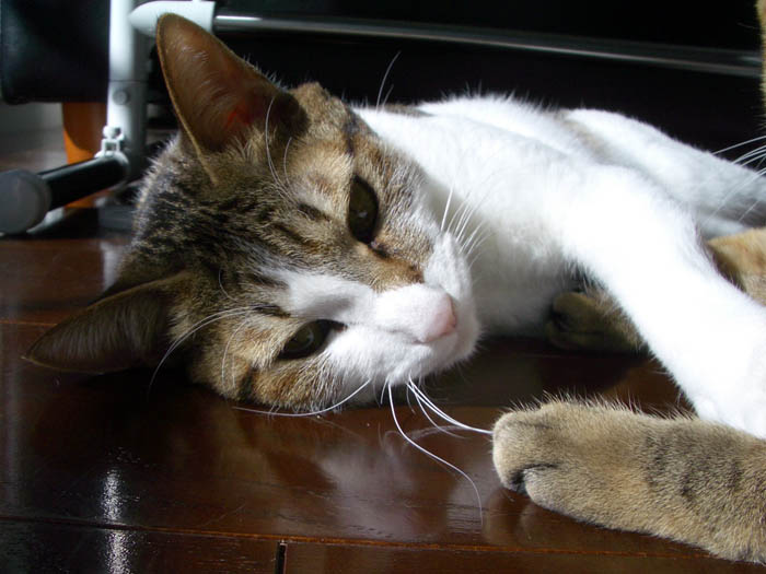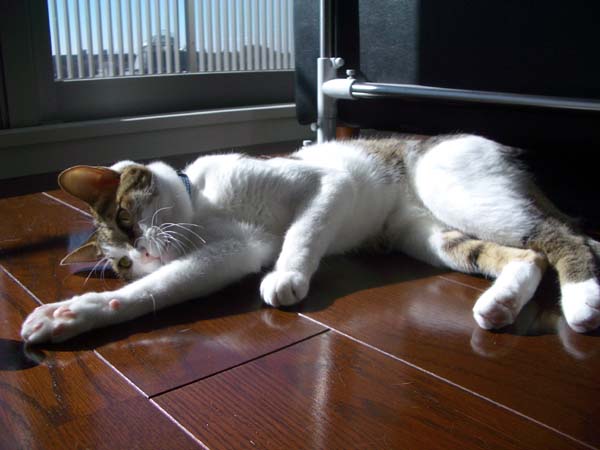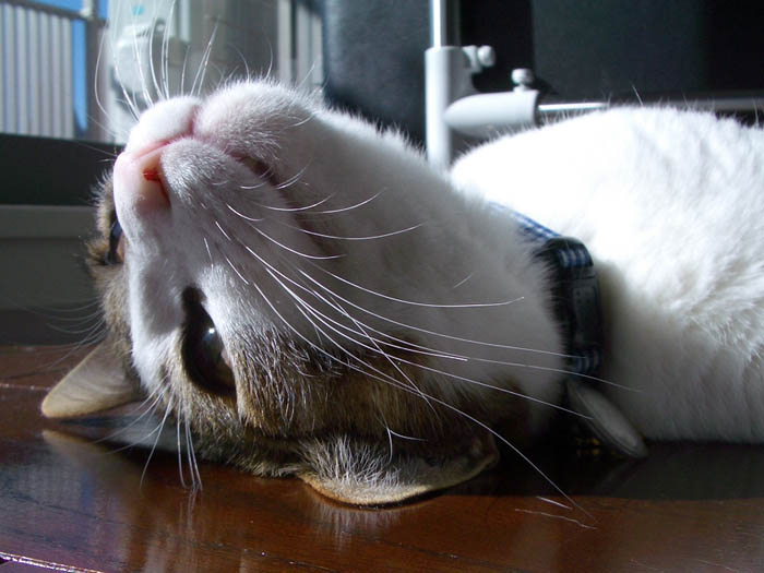 仰向けになり、暖かさに目を細めるぽっけ♂。