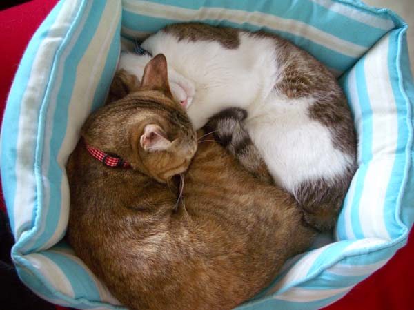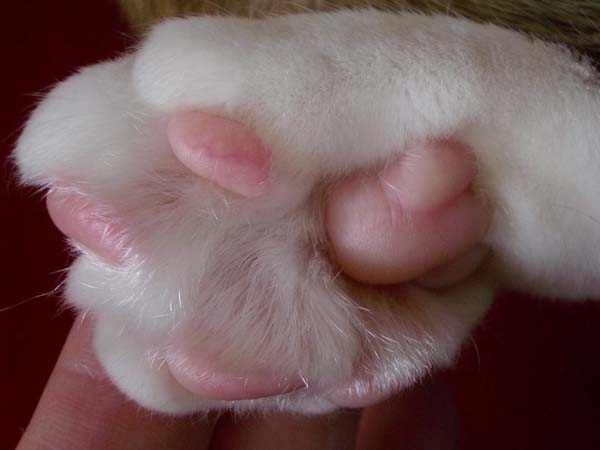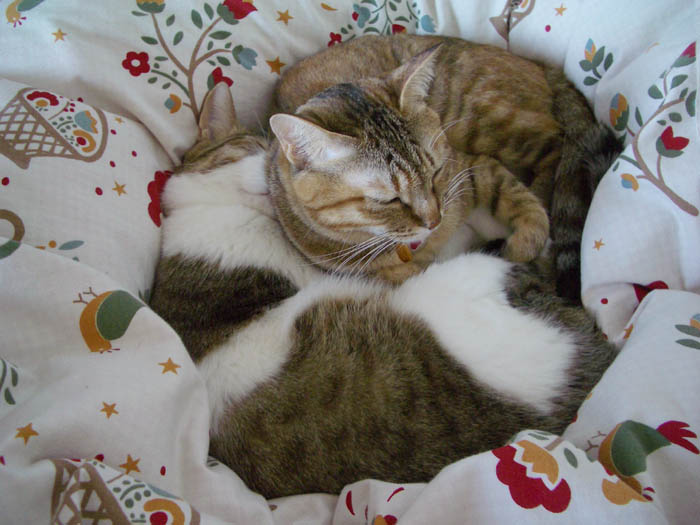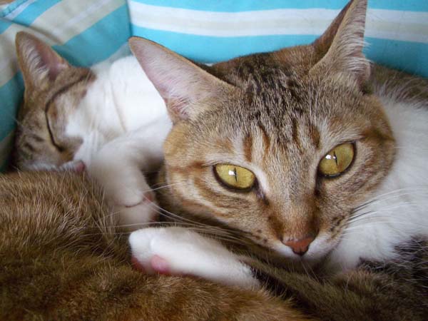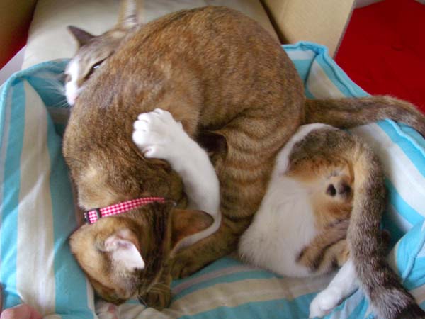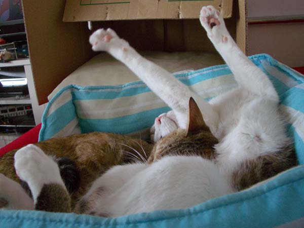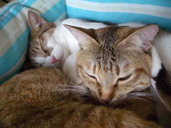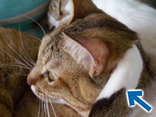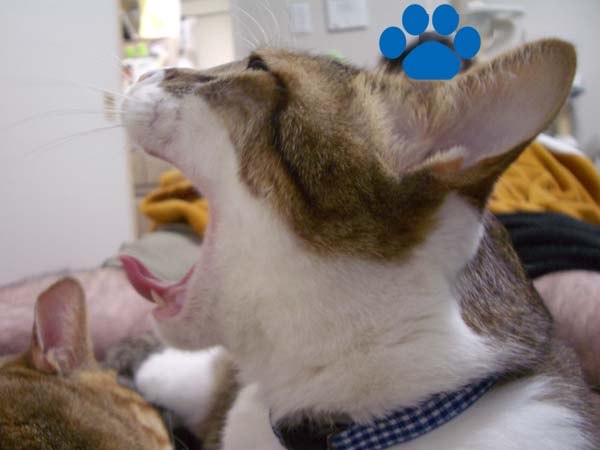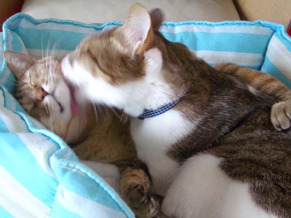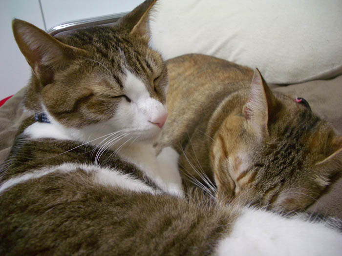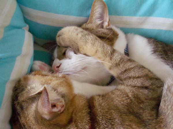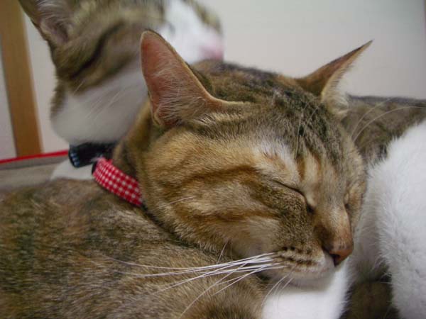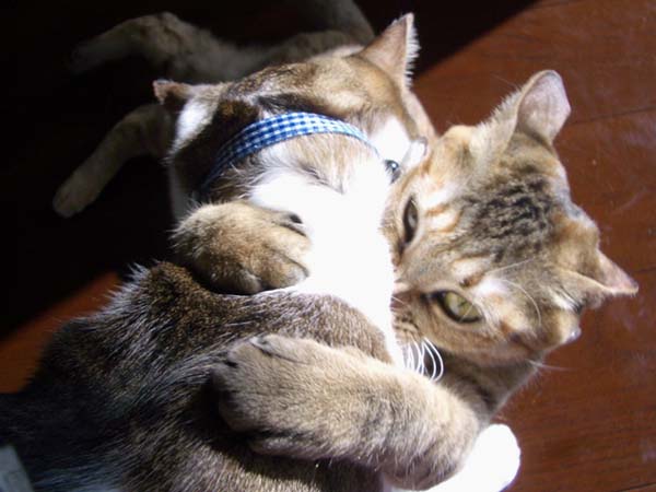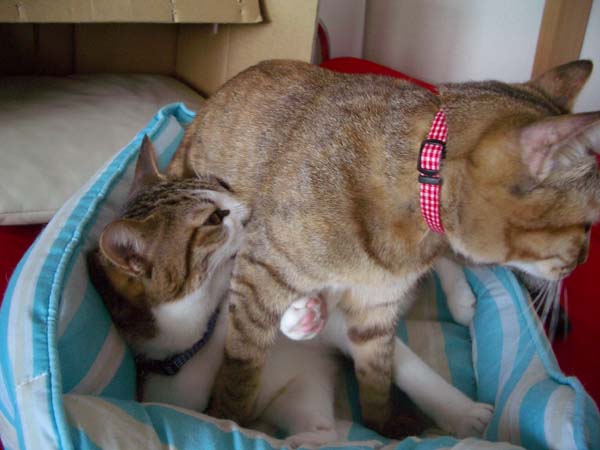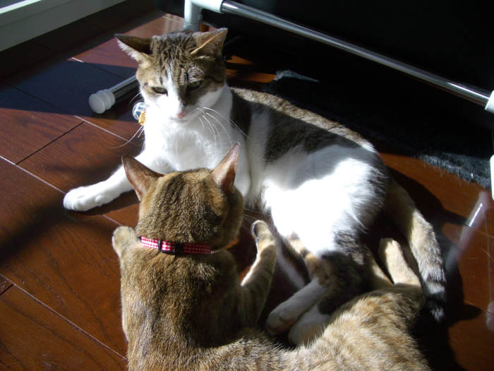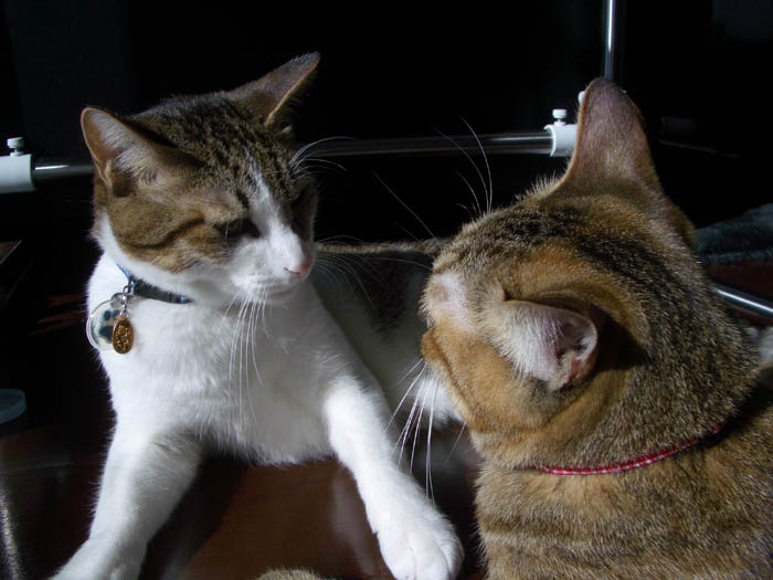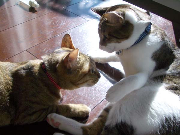 ぽっけ♂の顔に、ポフリとぴっち♀の猫パンチ