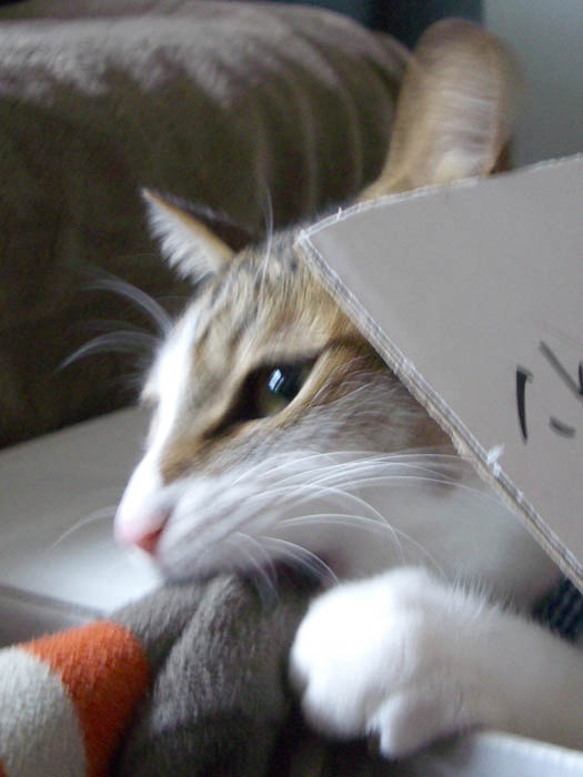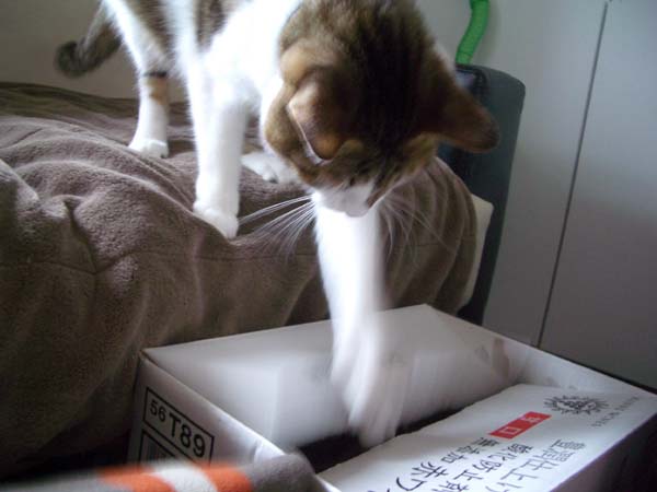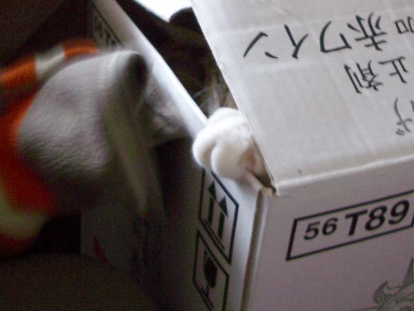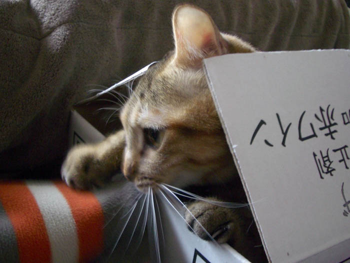 」再び箱の中から、袖口を齧るぴっち♀。