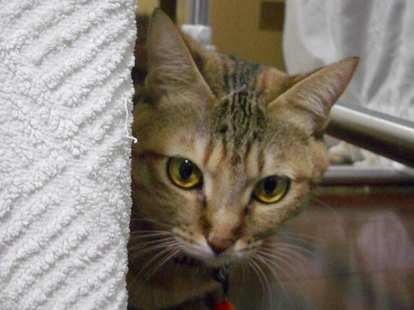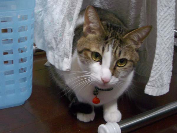タオルの影に猫が隠れています。