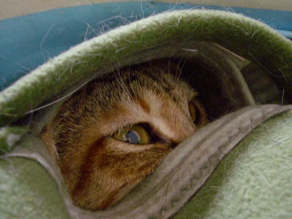 タオルの陰から猫じゃらしを狙っています。