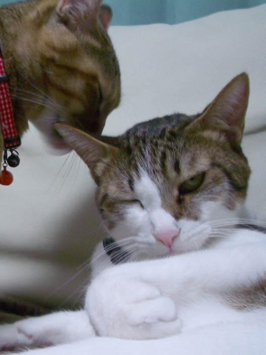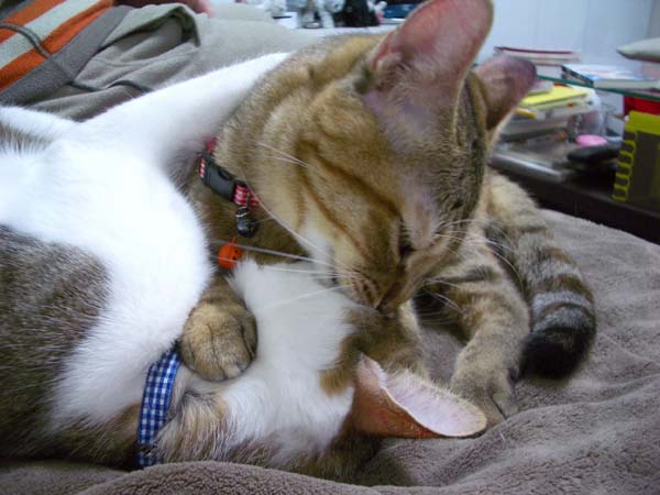 ぽっけ♂の耳をペロリ、ペロリと舐め始めました。
