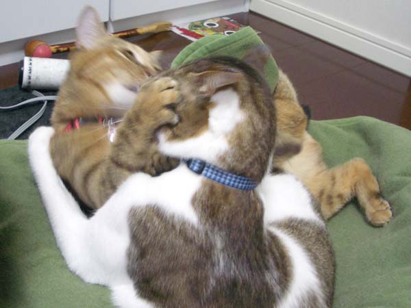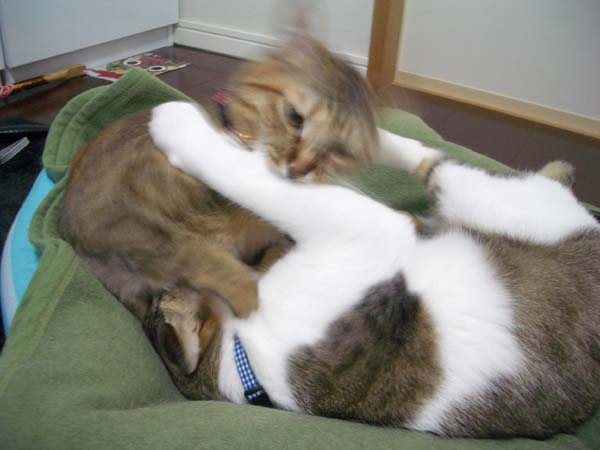 ぽっけ♂の連続猫キック喰らいながらも、