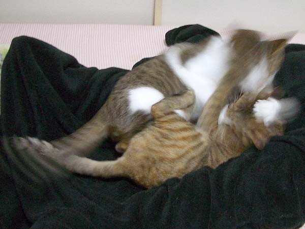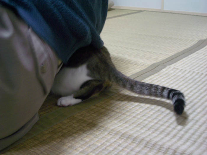 のお父さんの服へは潜らなかったものの、興味深々とばかりにぽっけ♂に飛び掛ったりと