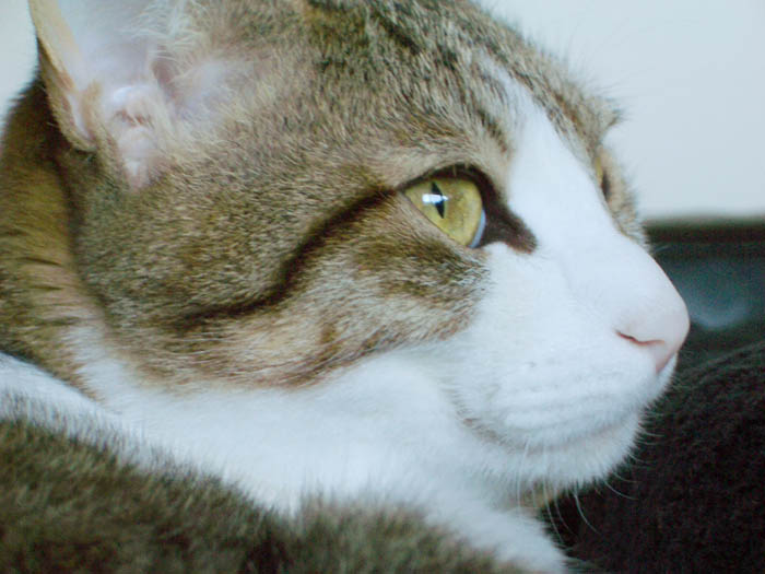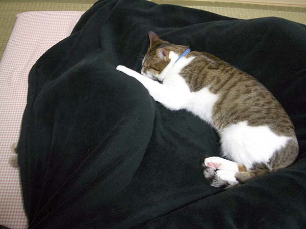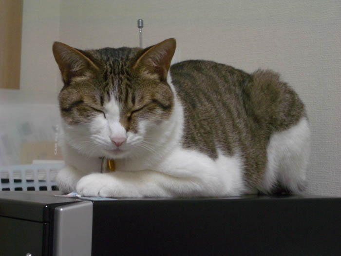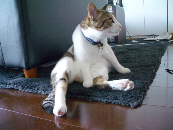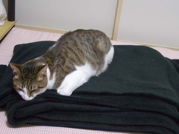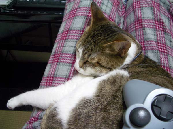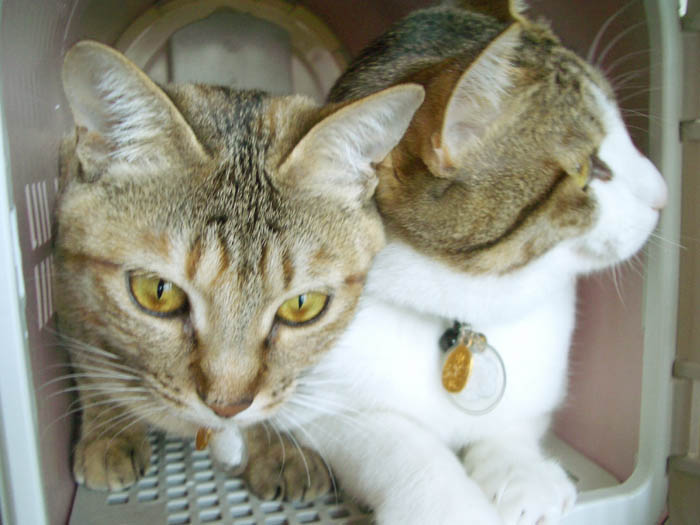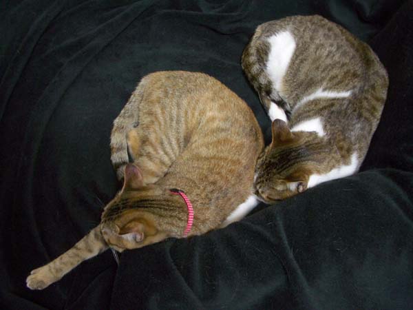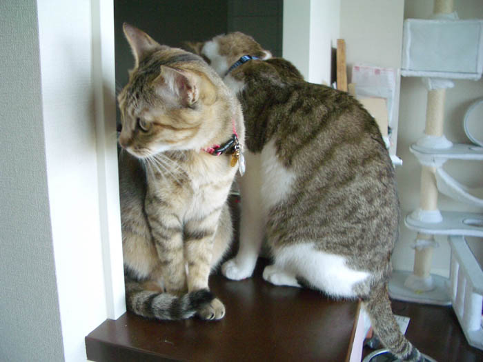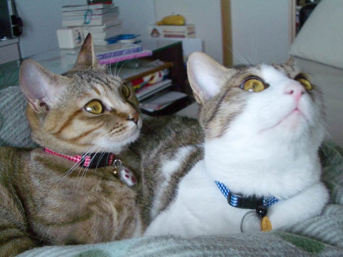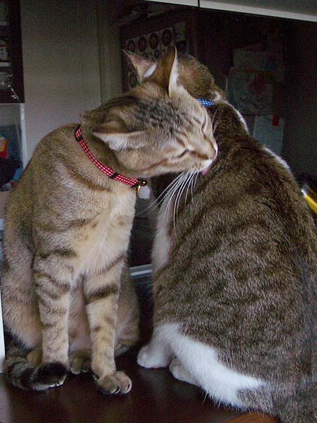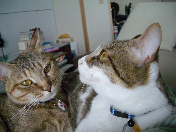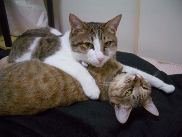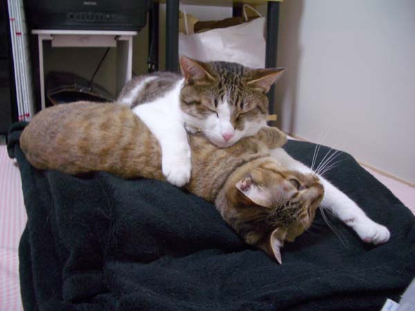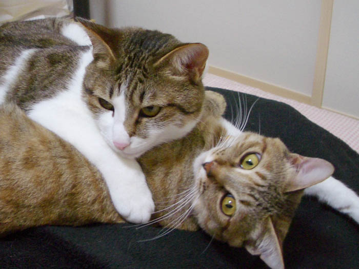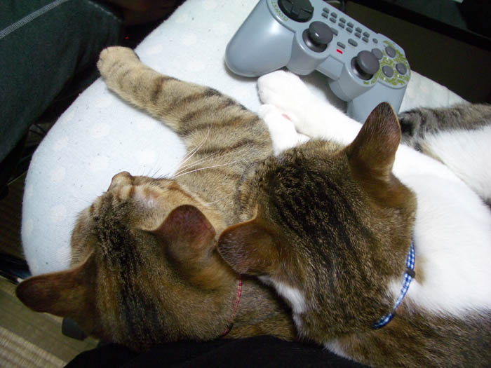 の膝の上で2匹盛りです。2匹の後頭部の模様を見比べてみたりと、