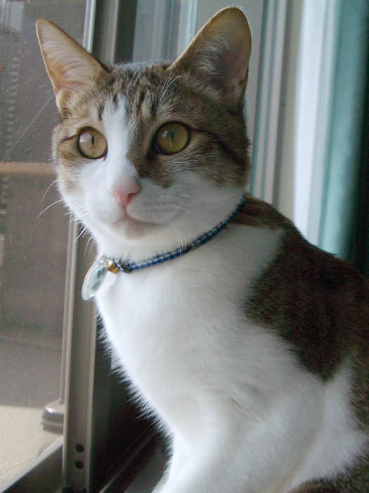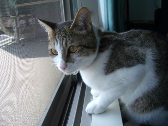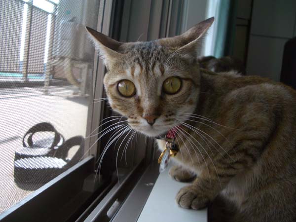 窓枠に前足をかけ、網戸越しにじっと外を見ています。