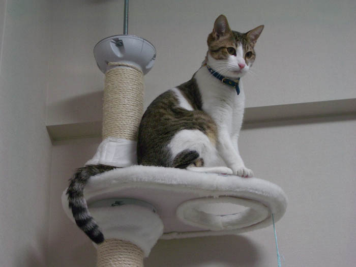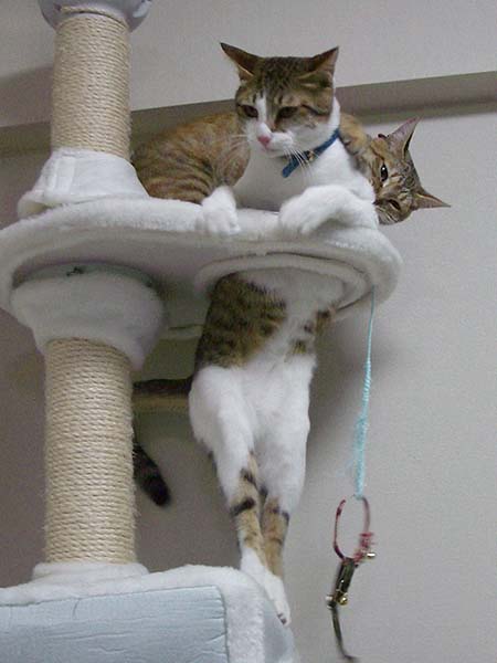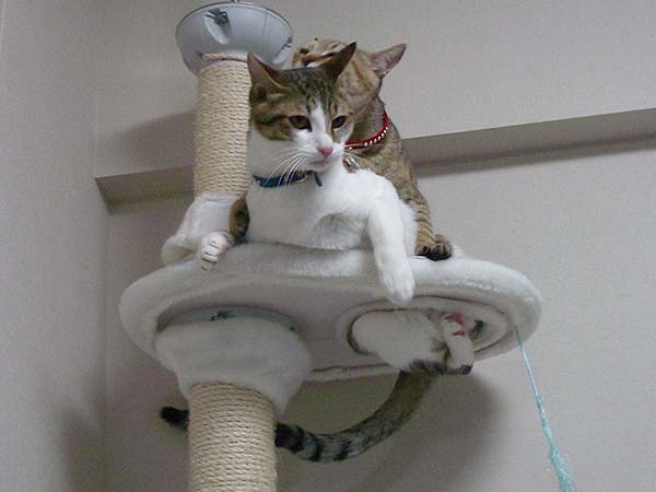 猫タワーでお昼寝中以外の2匹を一緒に撮影できると