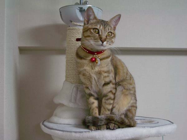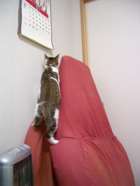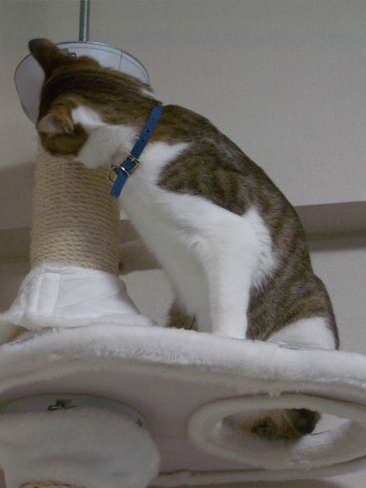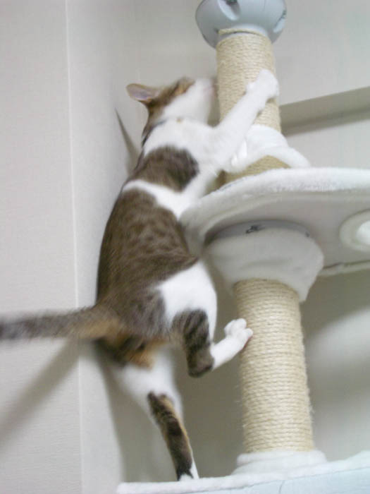 柱に巻きついて、面白い姿勢で爪とぎに励むぽっけ♂。