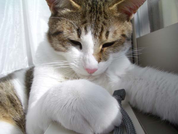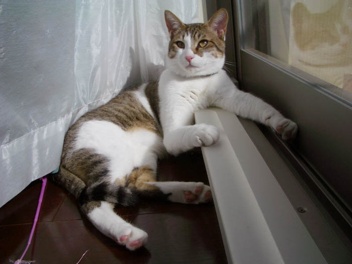 」窓際で寝そべって日向ぼっこをしていたぽっけ♂。