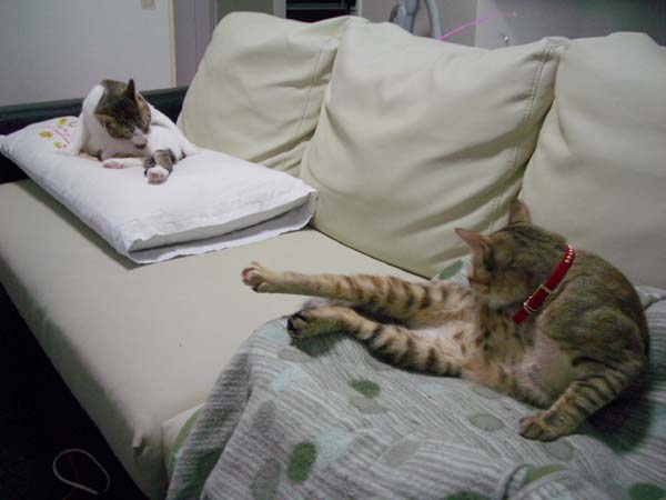 すぐ横のソファーの肘置きに避難していきました。