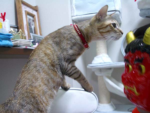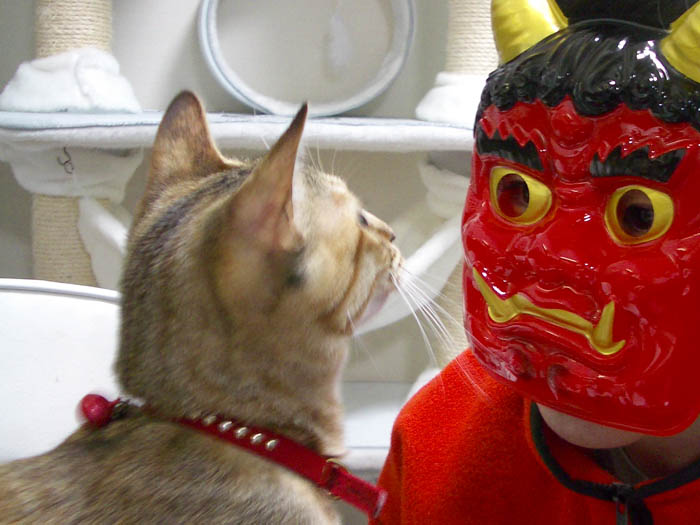 が鬼のお面をかぶって2匹とご対面。