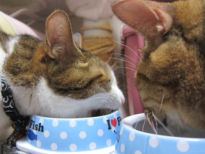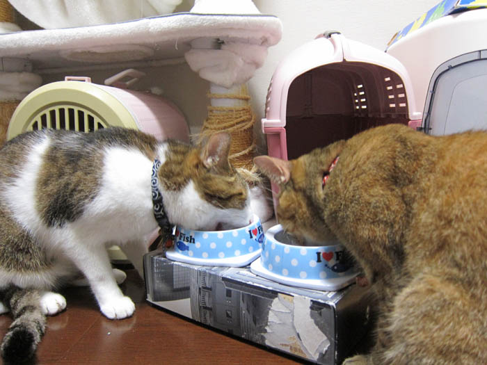 夜寝る前のゴハンを食べた後の2匹の様子。意外と色々やっています。