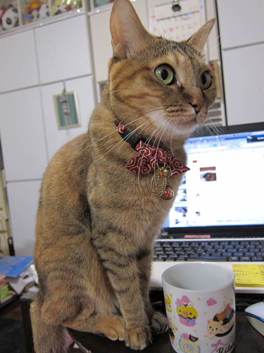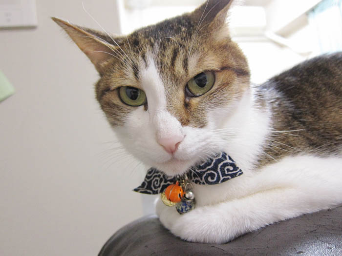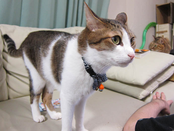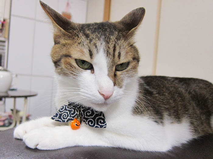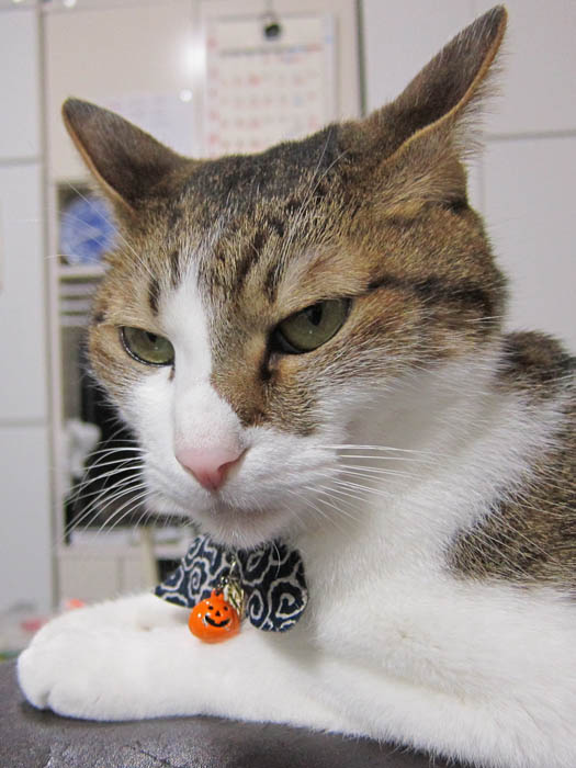 2008年 10/17(金) 62日目のぴっち♀とぽっけ♂(1) ~猫のハロウィン準備~新規写真追加。ハロウィンに向けて、お化けベルを装備した2匹。【丸】の中でブタさんと仲良くお昼寝。