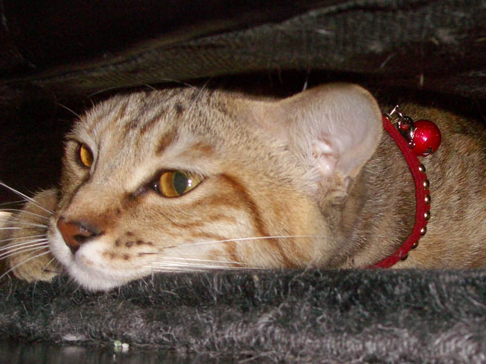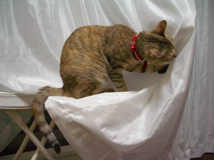 カーテンがかかった椅子に乗って遊ぶぴっち♀。