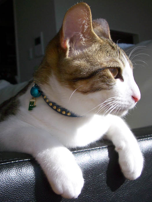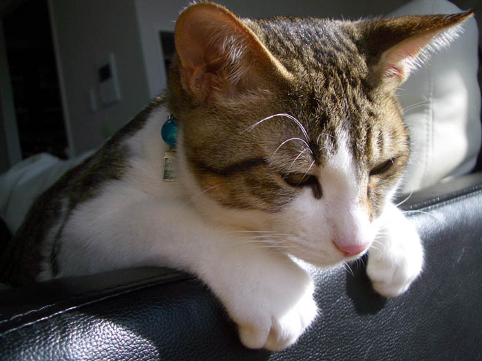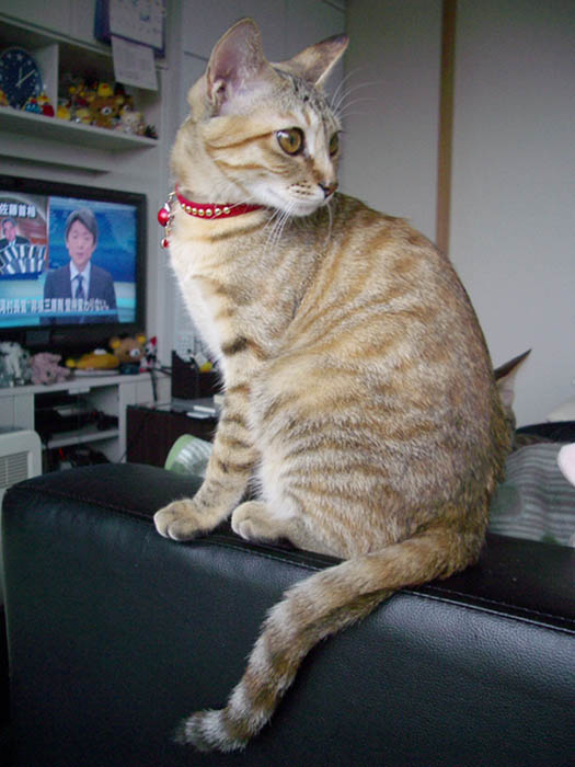私達のすぐ横、ソファーの肘掛に前足