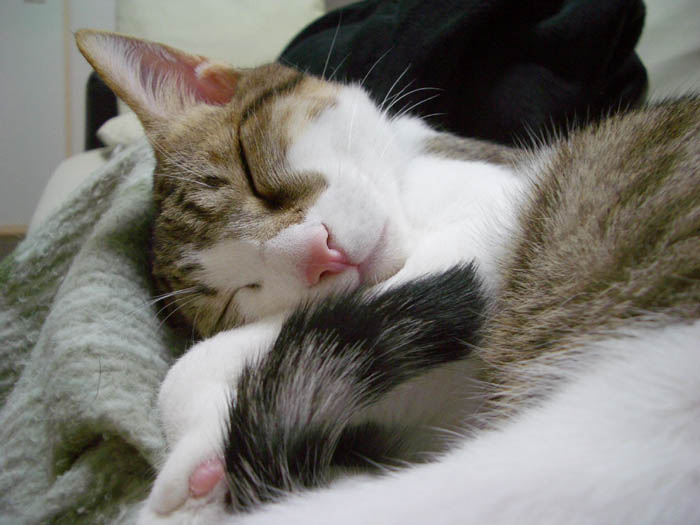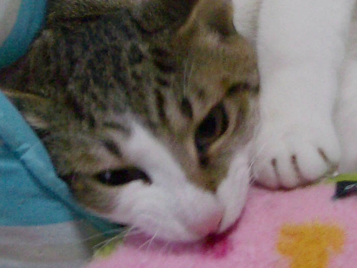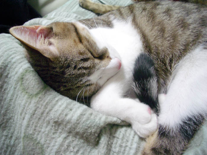 「V」の字でお昼寝中のぽっけ♂。