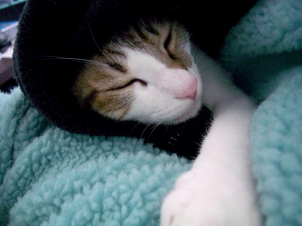 猫ベッドでお昼寝から目覚めたぽっけ♂。