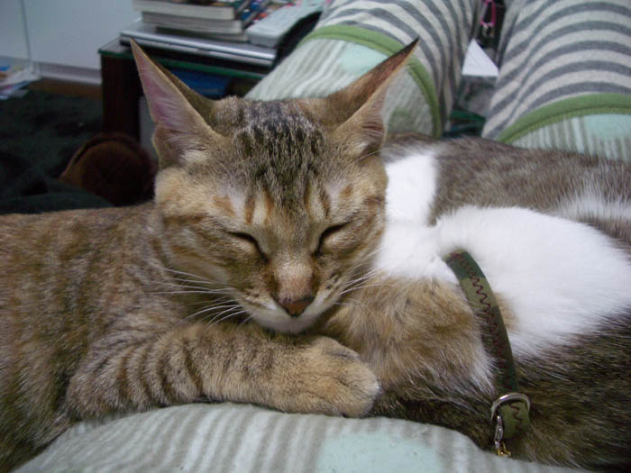 でちょい。ソファーでお昼寝中のぽっけ♂の元へ