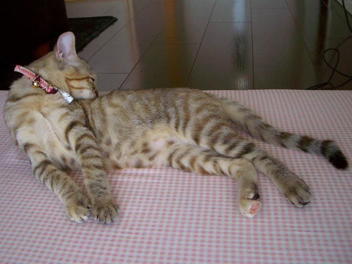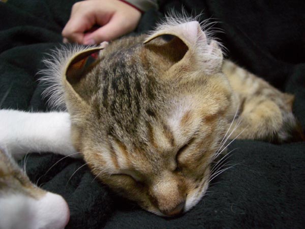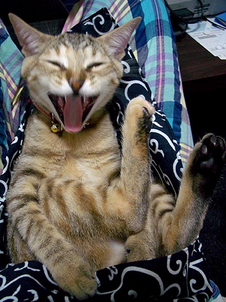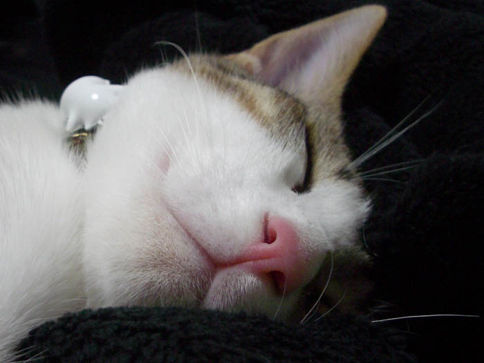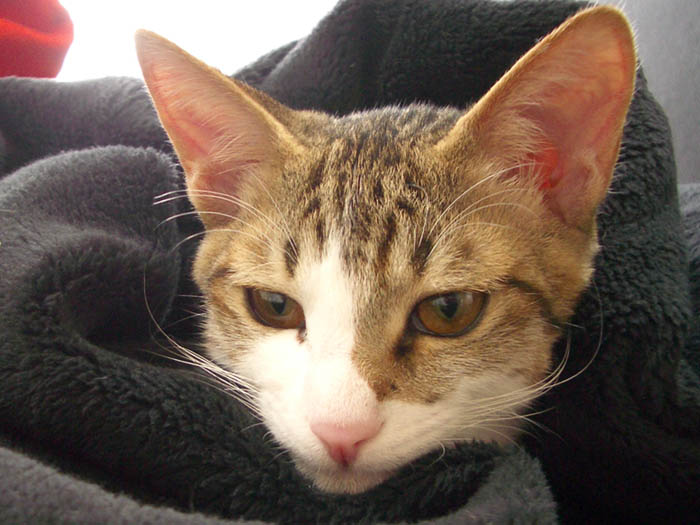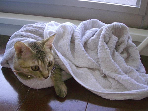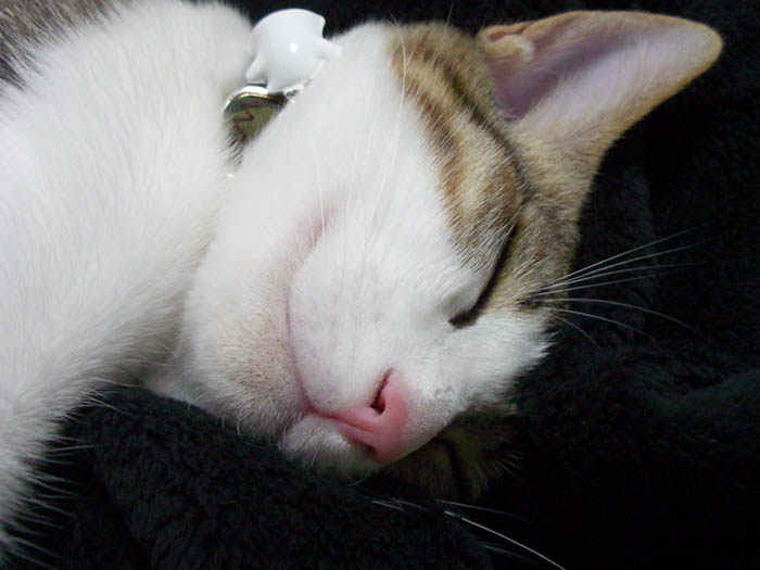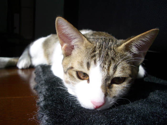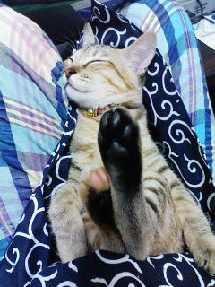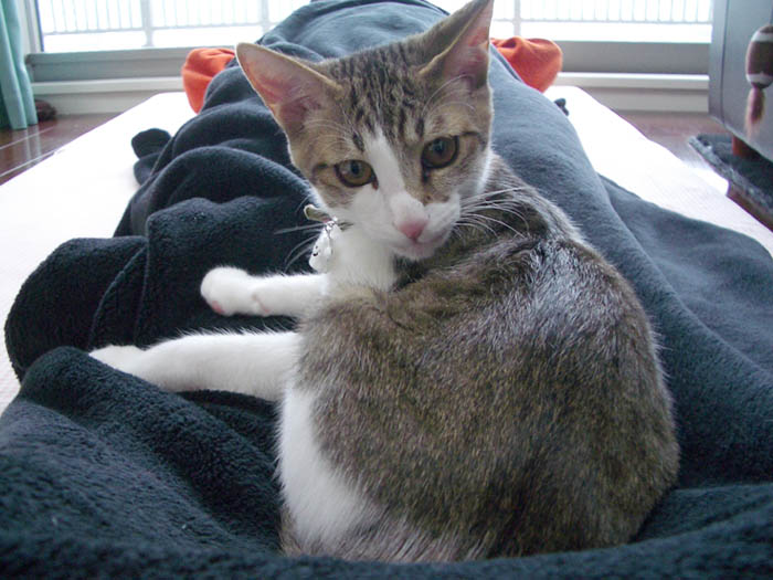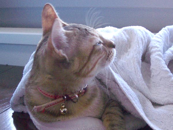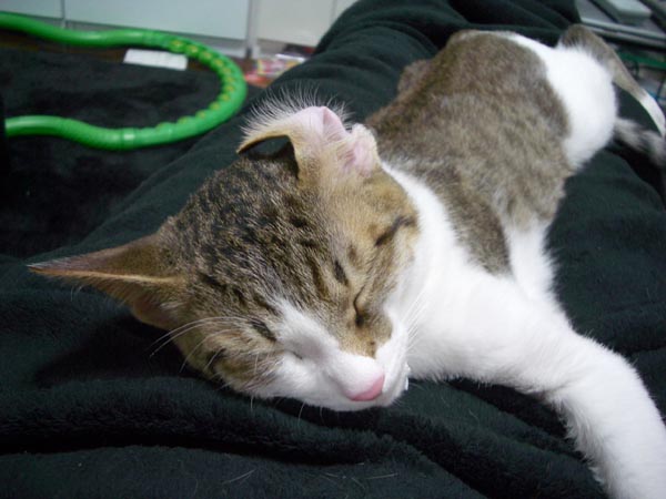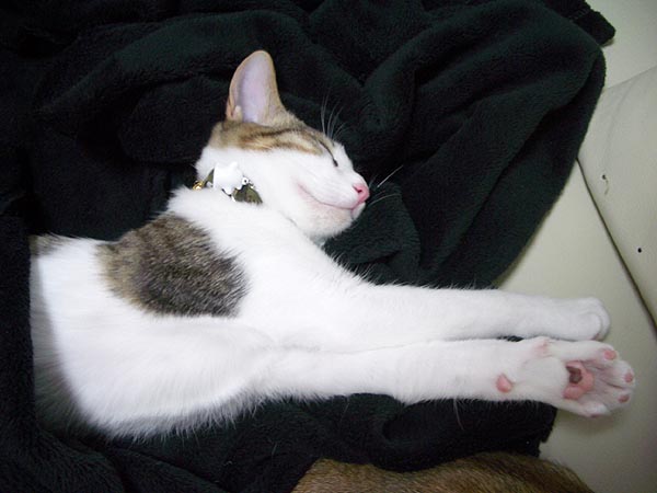 夕方、毛布の中から伸びつつ出てきたぽっけ♂。