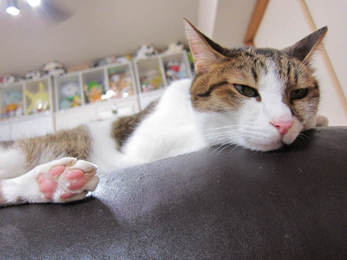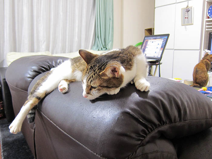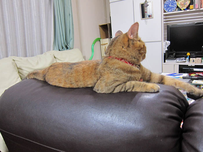 ソファーの背もたれの上で、