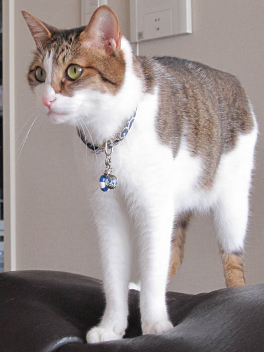 2011年 8/5(金) 1084日目のぴっち♀とぽっけ♂ ~タオルマントな猫~ぴっち♀の芸術作品にされた我が家のタオル達。穴あき部分を頭に通してタオルマント猫に変身