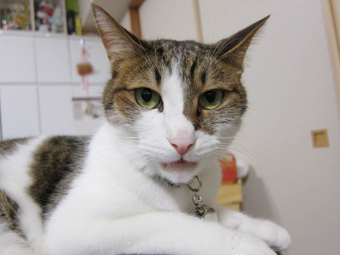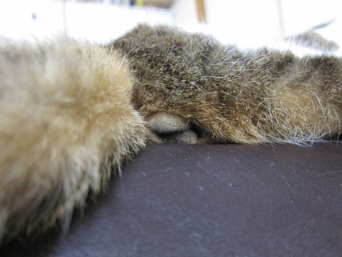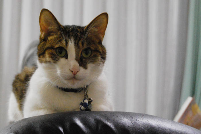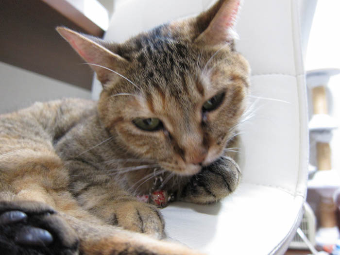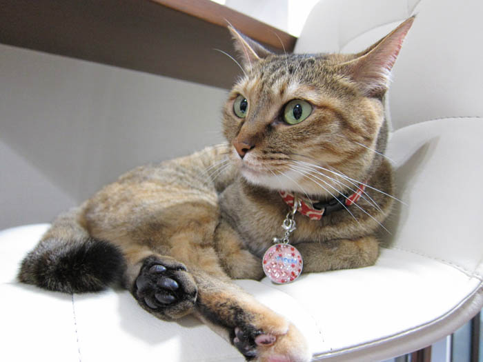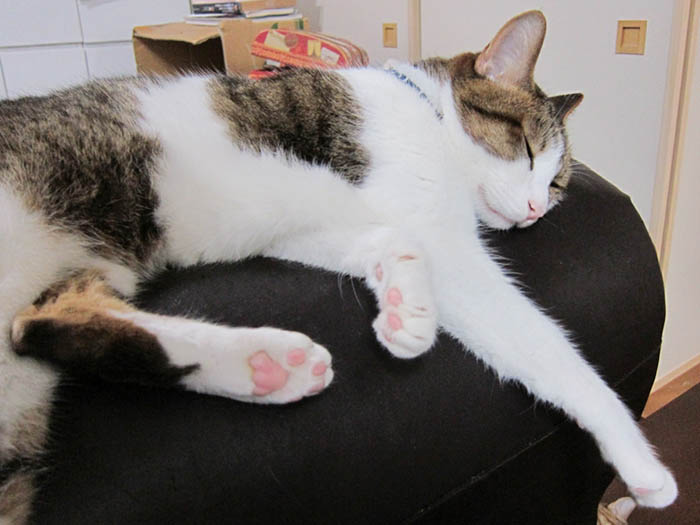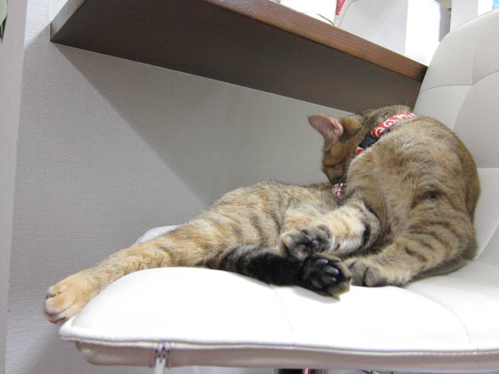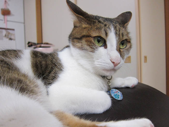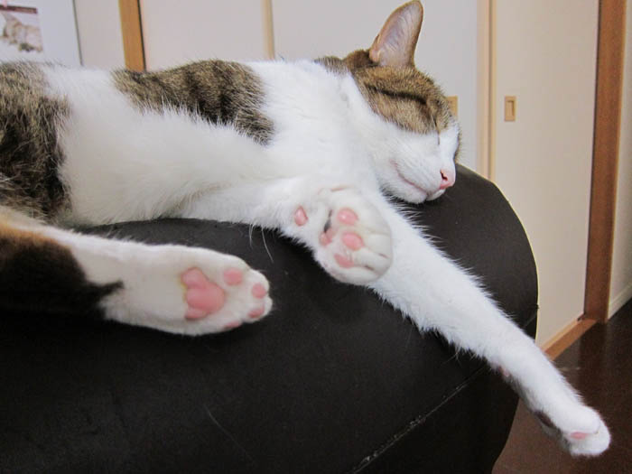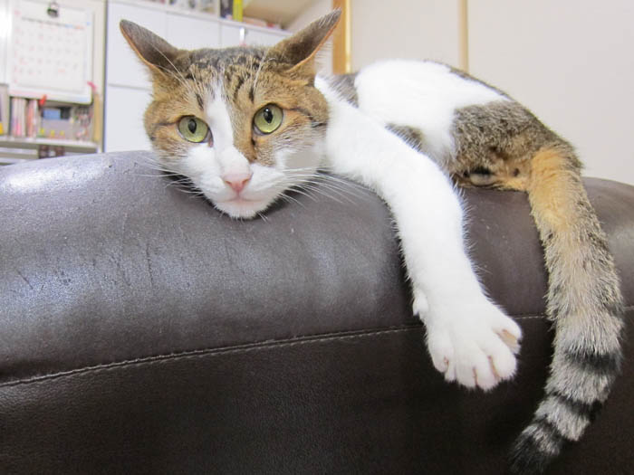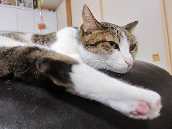 2012年 7/16(月) 1430日目のぴっち♀とぽっけ♂ ~猫だって置ける~ソファーの肘置きは、人間の「肘」だけでなく、猫のも置けます。