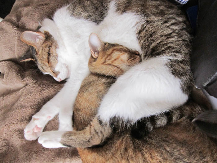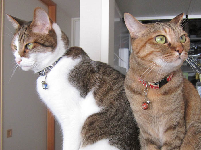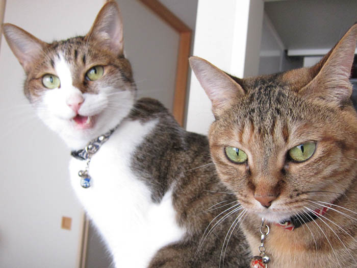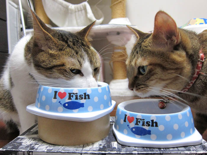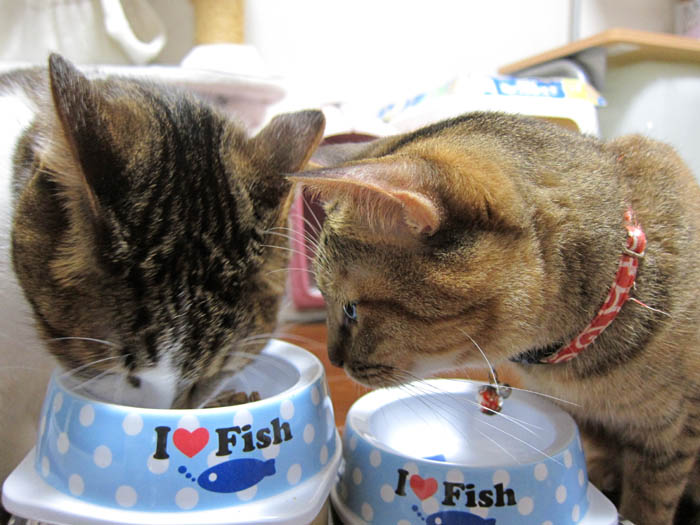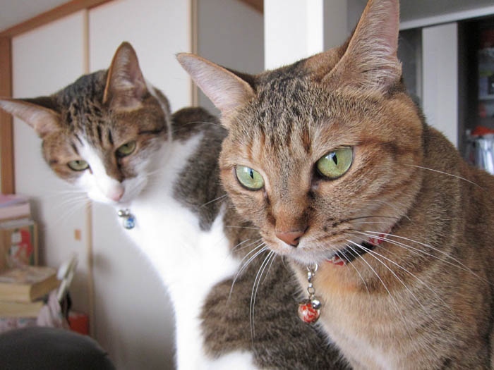 2009年 7/23(木) 341日目のぴっち♀とぽっけ♂ ~身をもって実感~猫定番のアレを実体験。いつもは取りあってケンカをするけれど、たまには分け合うこともあるようです。