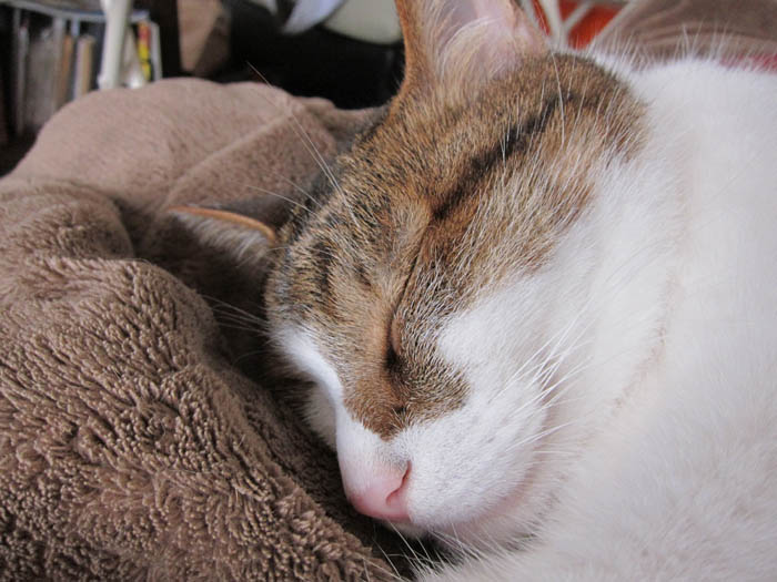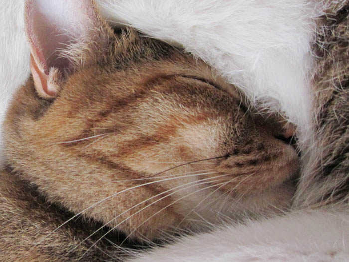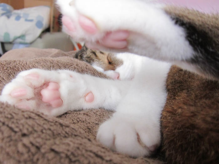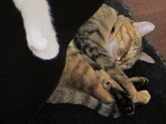 2010年 7/25(日) 708日目のぴっち♀とぽっけ♂ ~たまにはぴっち♀枕~ 低反発マットでお昼寝の2匹。黒いカバーに猫毛がビッシリ。もう……スゴイです