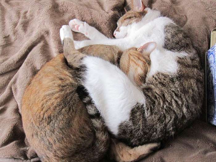2009年 7/26(日) 344日目のぴっち♀とぽっけ♂ ~フテ寝で半分こ~珍しくメディカル枕を仲良く使う2匹。その訳は、同志の絆