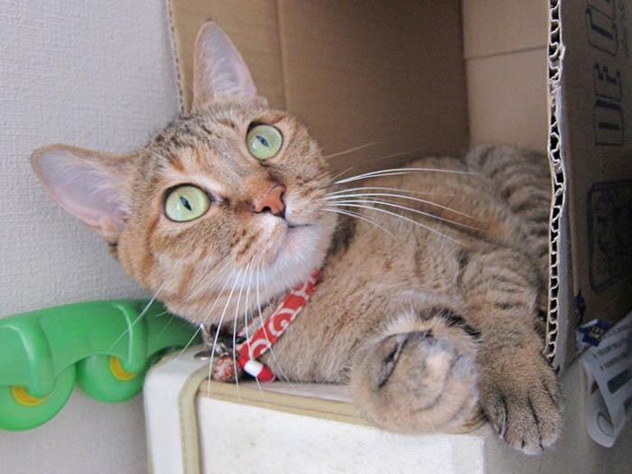 2009年 7/13(月) 331日目のぴっち♀とぽっけ♂ ~獲物を狙って~新規写真追加。手に入れた細長~い段ボールで2匹を遊ばせたいと思いつつ……。