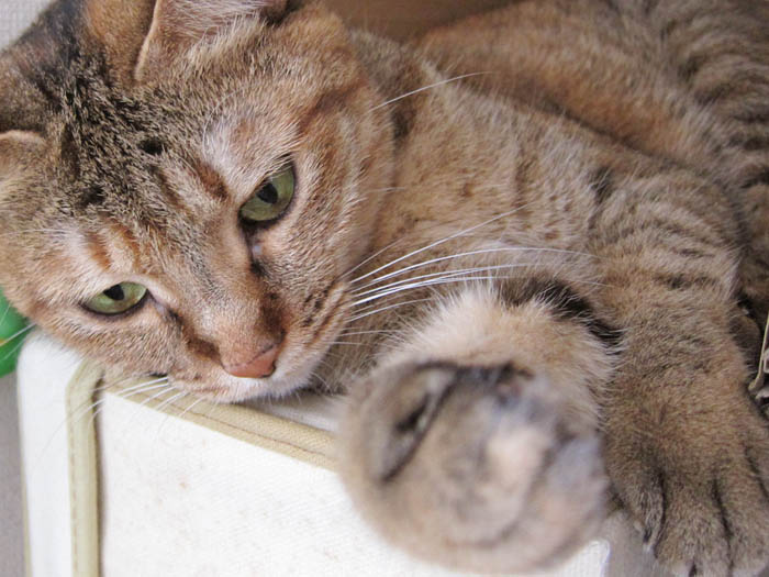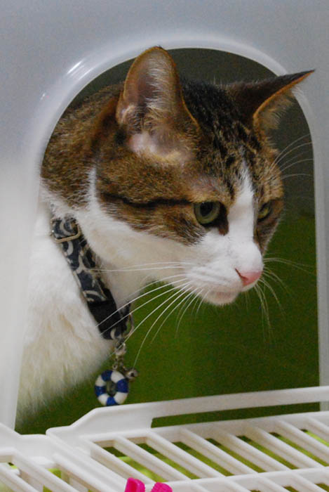 2011年 7/24(日) 1072日目のぴっち♀とぽっけ♂ ~チョーダイ!2~マンションの消防点検で2匹をキャリーバックへ。中の配置が微妙なことに……。ご褒美はおやつです。
