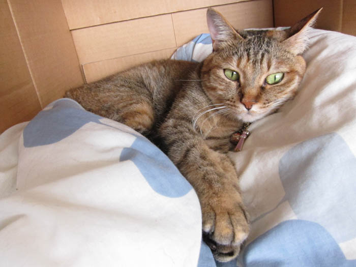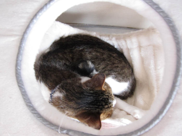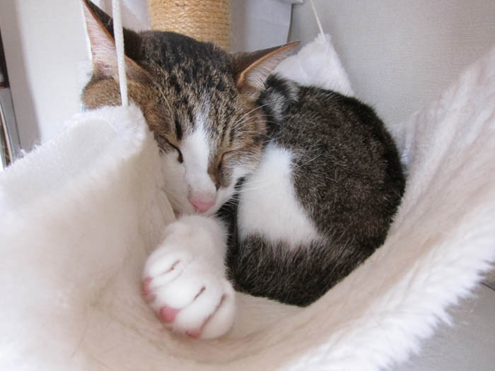 2010年 6/17(木) 670日目のぴっち♀とぽっけ♂ ~猫ベッドからの脱出~暑さのため、お昼寝姿を工夫した結果らしいぽっけ♂の素敵寝姿。ぴったりくっついていたぴっち♀も……。