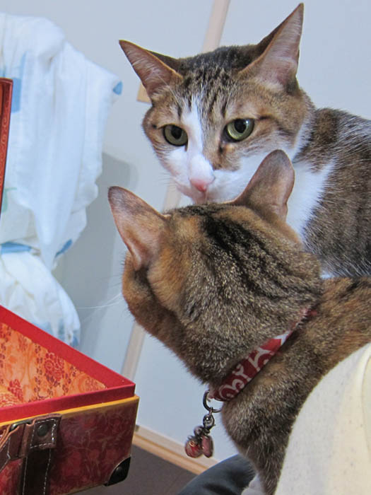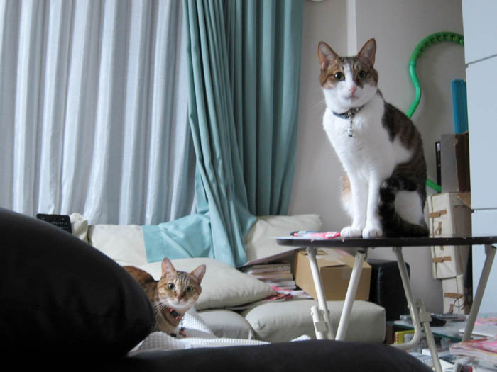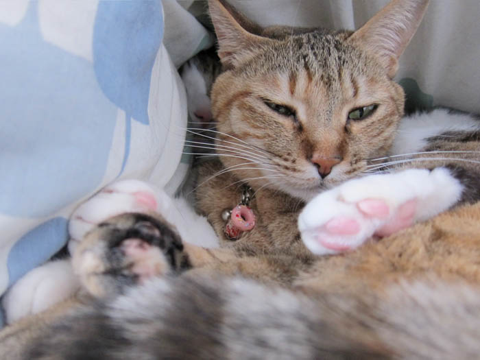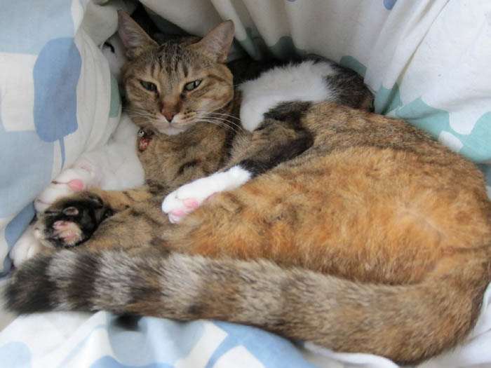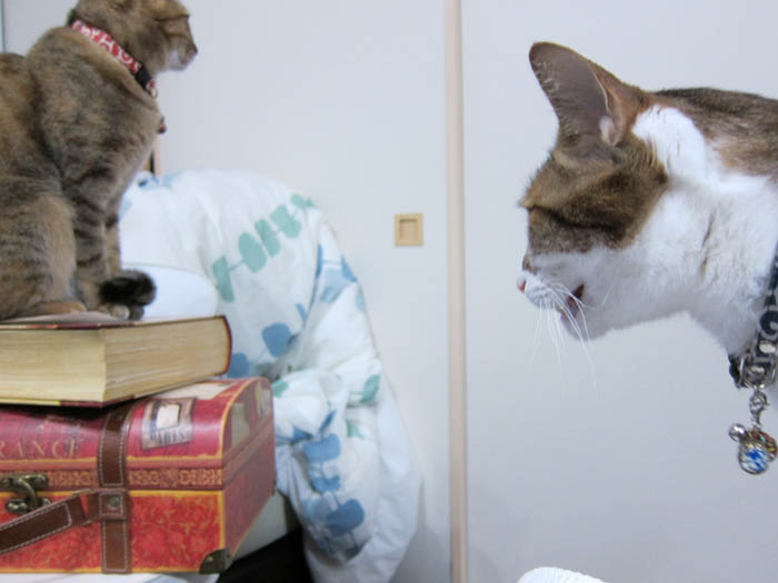 2012年 3/14(水) 1306日目のぴっち♀とぽっけ♂ ~猫の寝床事情~先客がいる寝床へ合流する時の2匹のルールを守らないと……。